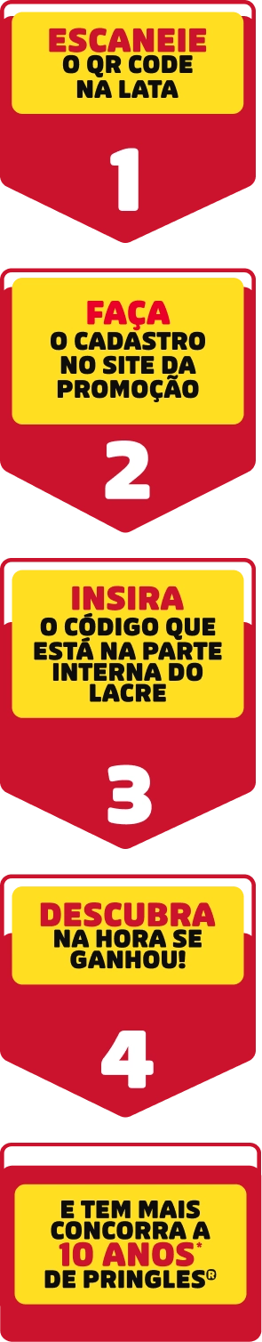 Participação válida de 01/02/2026 a 15/05/2026. Certificados de Autorização SPA/ME Nºs 04.047047/2025 e 05.047046/2025. Consulte condições de participação e regulamento completo em www.pringlespromo.com.br. *Prêmio entregue em cartão pré-pago, sem função de saque e transferência, com sugestão de uso para 10 (dez) anos de Pringles®.